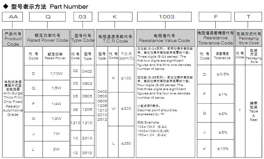 風(fēng)華高科車規(guī)抗浪涌厚膜片式固定電阻器型號命名規(guī)則: