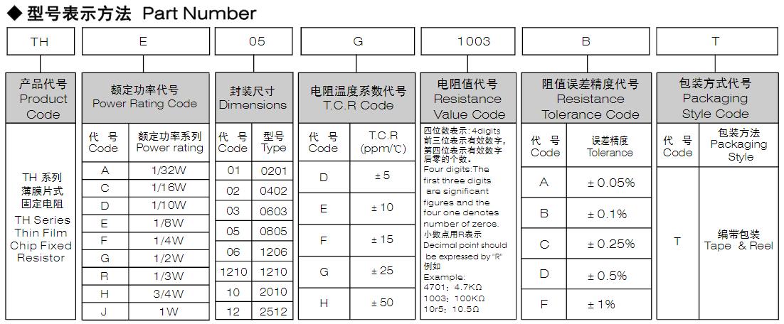 風華高科高穩(wěn)定性薄膜片式固定電阻器 - TH 系列型號命名規(guī)則:
