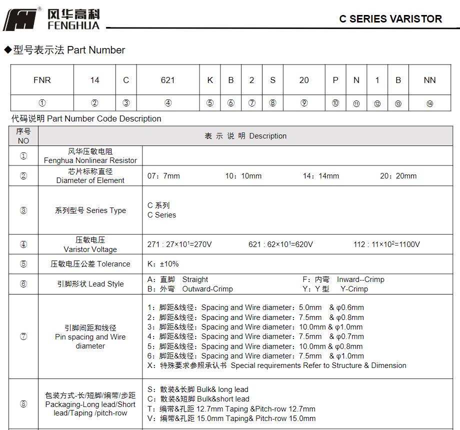 風華高科C系列壓敏電阻器型號命名規(guī)則: