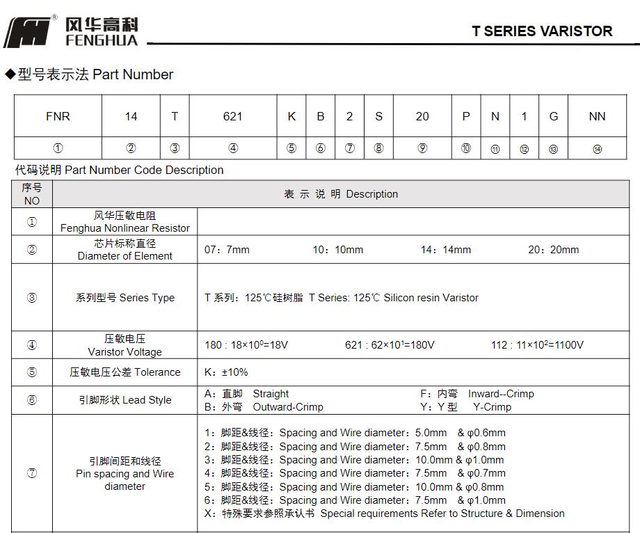 風(fēng)華高科T系列壓敏電阻器型號命名規(guī)則: