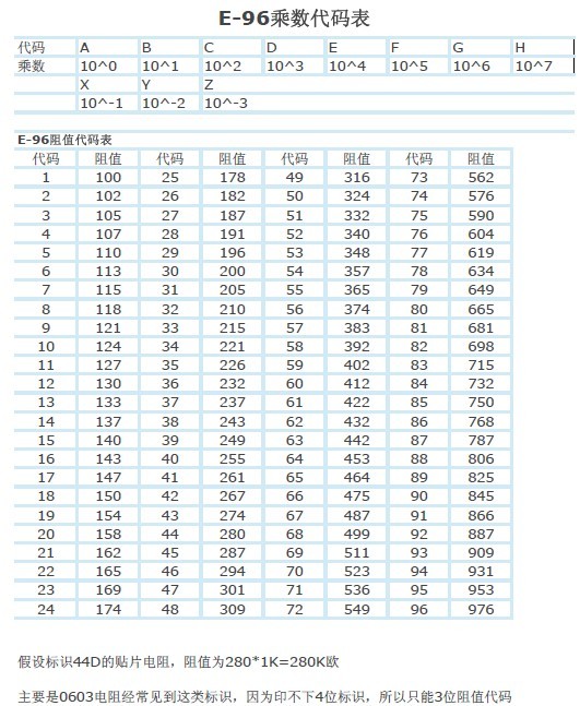 貼片電阻E-96 系列(0603)公稱阻值代碼對照以及乘數(shù)代碼對照表: