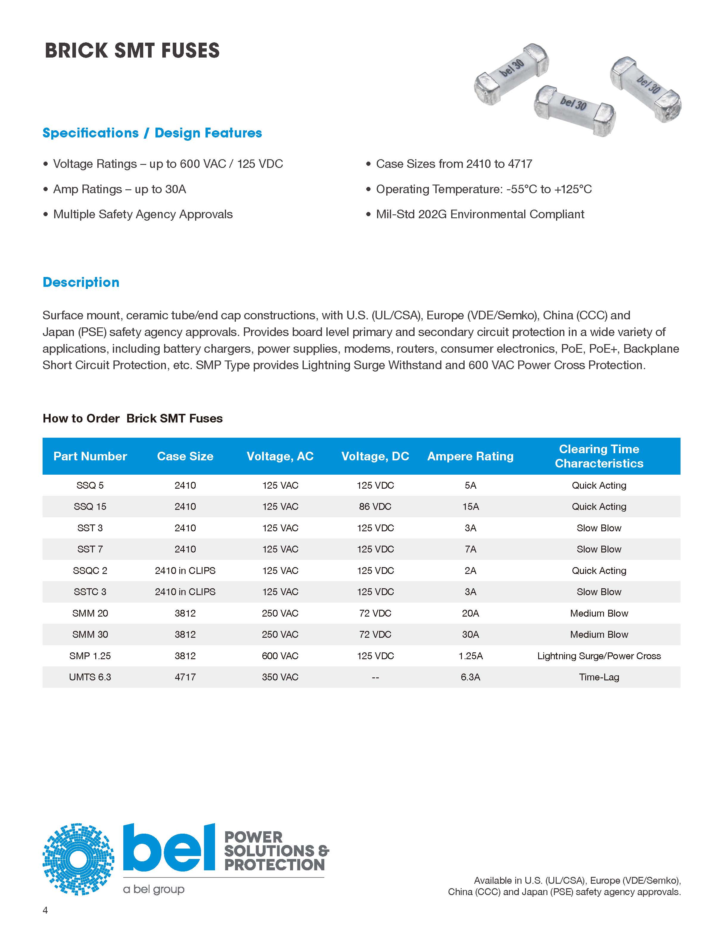 表面貼裝保險絲 提供兩種類型的產(chǎn)品。陶瓷基板上的厚膜芯片技術(shù),具有0402、0603和1206的外殼尺寸,這是具有UL,CSA和CE認(rèn)證以及表面貼裝,“磚”式,陶瓷管/端蓋結(jié)構(gòu)的低成本解決方案。