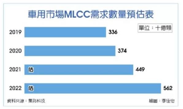 盡管消費性產(chǎn)品需求轉弱,但自第三季起至今,汽車市場維持強勁的需求,成為供應商在新產(chǎn)品規(guī)劃與產(chǎn)能擴增的重點方向。預估2021、2022年車用MLCC需求將上看4,490億顆、5,620億顆,年增率將達20%、25%。